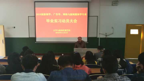 本网讯 (通讯员 周美婷) 为提高学生对专业实习的统一认识,做好实习前的必要思想准备、组织准备和物质准备,为专业实习打下前期工作基础,保证实习质量和效果。我院于 11月3日在砂子坳校区1207教室召开了2018届新闻传播类专业毕业实习动员大会。党委副书记向军,副院长彭广林,新闻专业主任李端生,网络与新媒体专业主任张冀,教务秘书粟幸福,2014级新闻班班级导师梅黎、网媒班班级导师陈文敏,2014级辅导员鲁明新参与本次会议。2014级新闻班、广告班、网络与新媒体班全体同学到场参加本次会议。会议由李端生主持。